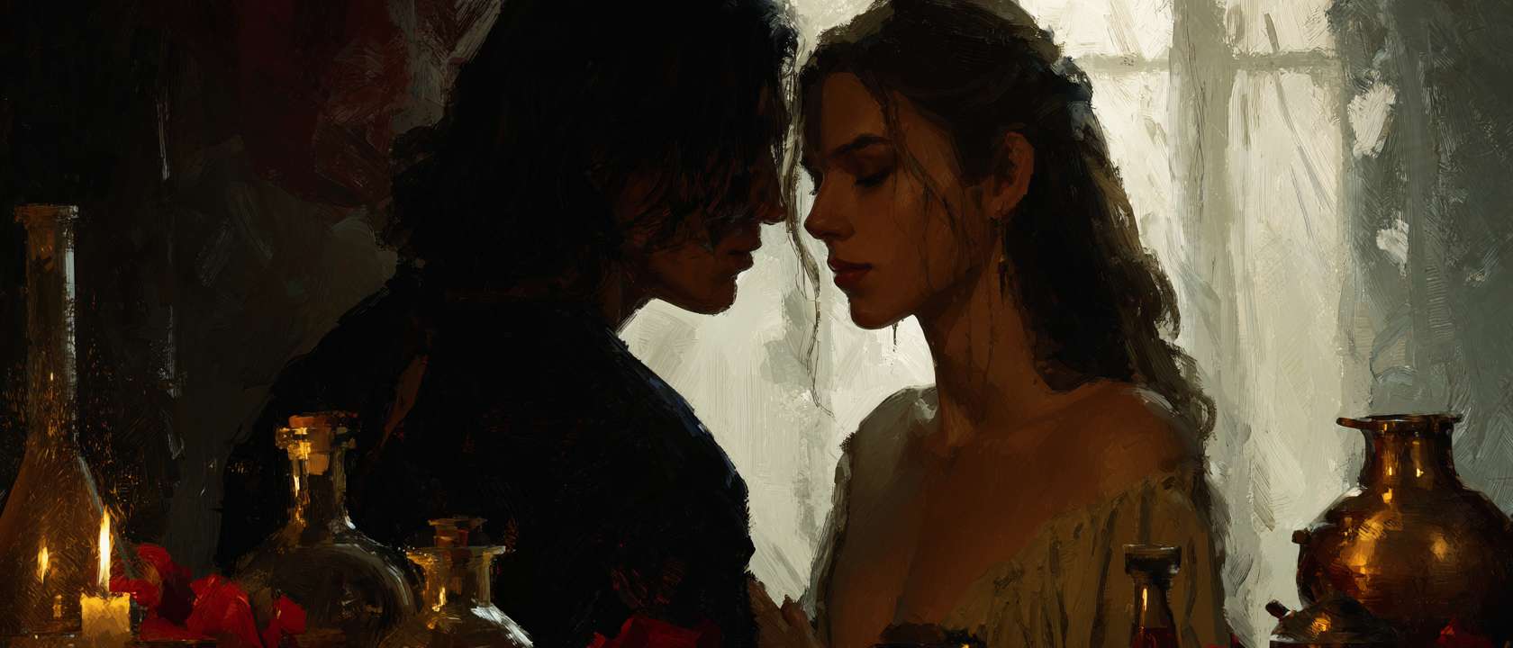 "You know it's complicated. My family's expectations. Your guild standing. The... arrangement they're trying to make for me." "I know." You press your lips to her hair, breathe in the scent of her sweat mingled with jasmine. "But I'm tired of counting days between each stolen hour." She doesn't answer. Her finger continues its path across your chest, but slower now—the playful loops becoming something more deliberate. A letter, you realize. Then another. She's writing something against your skin, and you don't know if she's aware she's doing it. The shape of a word she can't yet speak aloud. You feel her breath catch. Hold. The small muscles of her shoulders tense against your arm. The coals settle in the alembic with a soft sound, sending up a brief flare of warmth. In that momentary glow, you see her face—eyes closed, lower lip caught between her teeth. Not the performance of vulnerability she wields so expertly in their game. Something rawer. The face of a woman standing at a threshold, calculating the cost of crossing it. Her finger stills. Presses flat against your heart. The silence stretches. You make yourself wait, though everything in you wants to fill it with promises, with plans, with words that might make this easier for her. But you've learned something in your years of working with essences: some transformations cannot be rushed. Some things must choose their own moment to become. When she finally speaks, her voice is so quiet the words are barely more than breath against your collarbone: "So am I."